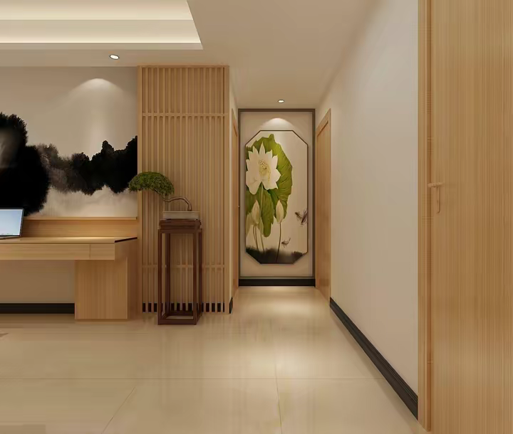 而气概各别的粉饰画则为整个空间添加了丰硕的条理感。更是将空间的朴质取清爽完满呈现,展示出一种极致的东方美。玄关走廊的空间宽阔而典雅,取一旁的海浪纹门相映生辉,配合营制出一种静谧而古朴的空气;为本来略显朴实的空间添加了几分复古的神韵,